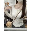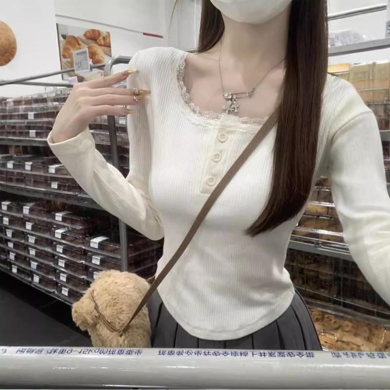 Spring Square Collar Pure Lace Splicing Long-sleeved Bottoming Shirt Women's Slim Front Shoulder Inner Shirt Top