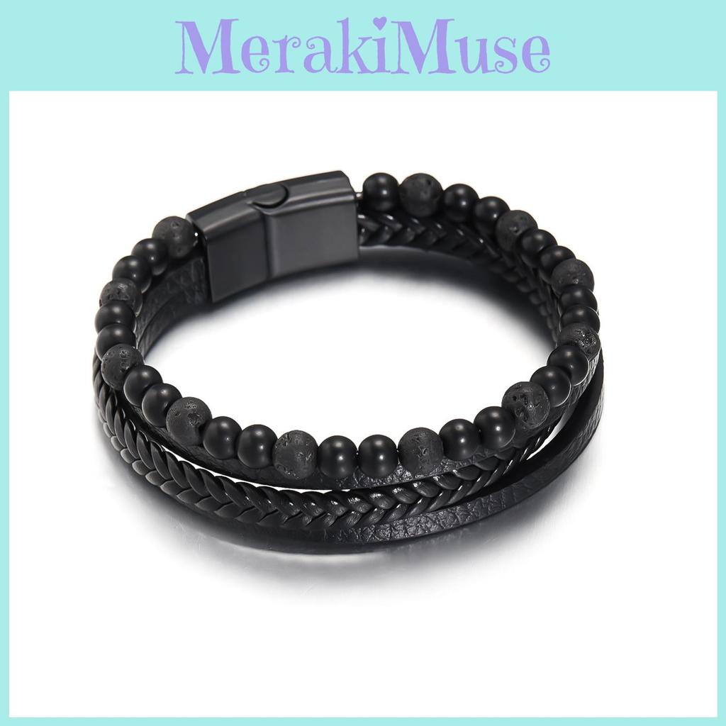 Geometric Style Mens Weaving Leather Wristband With Bead Design For Fashion And Travel