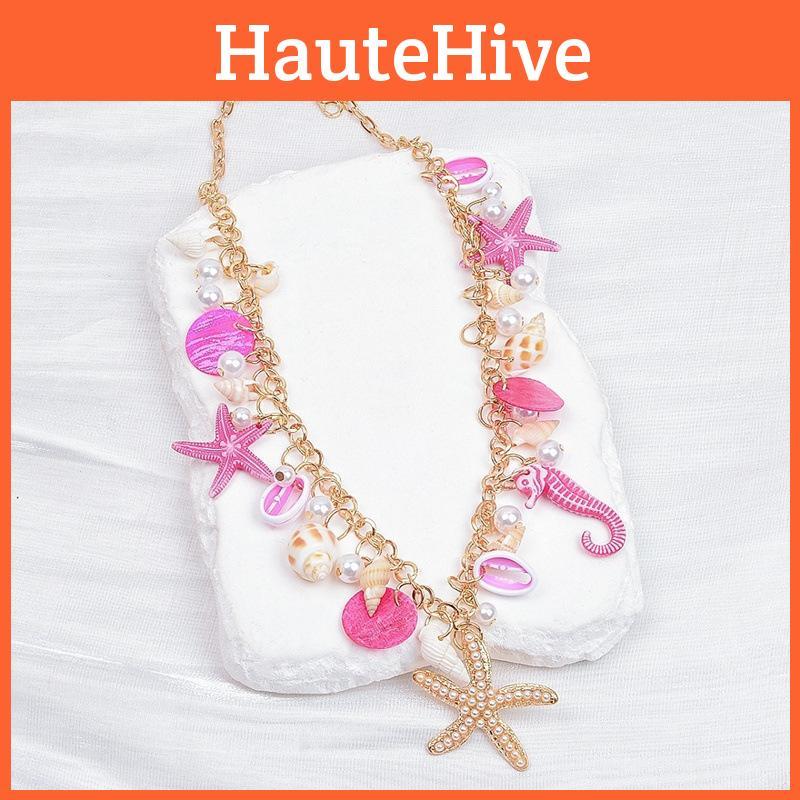 This women's beach-inspired shell necklace features a heart-shaped pendant adorned with starfish and shell accents, offering a stylish accessory for spring. Made of zinc alloy with electroplating, The necklace is ideal for casual outings or fashion-forward workwear. Wipe clean with a damp cloth to maintain its shine.