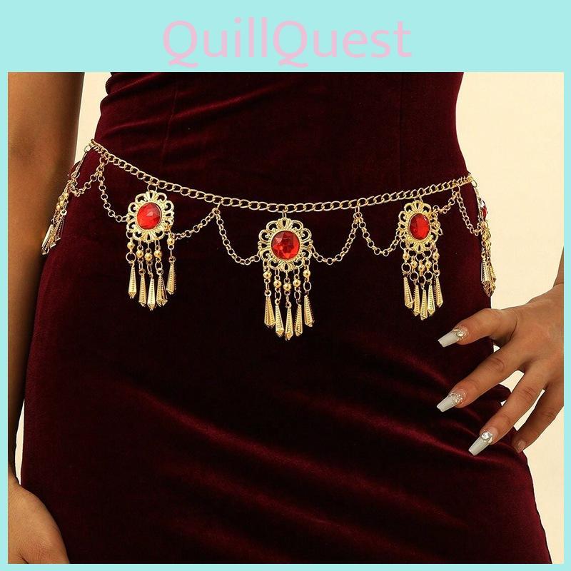 Bohemian Ethnic Red Acrylic Gemstone Fringe Waist Chain With Flower Pendant For Women