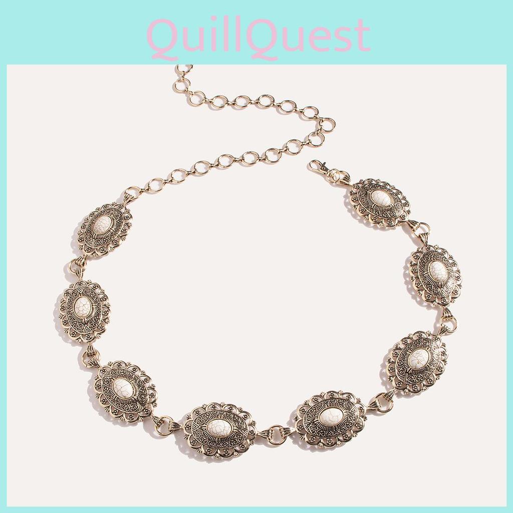 Gothic Style Metal Waist Belt With Intricate Engraving And Simulated White Turquoise Accent For Women