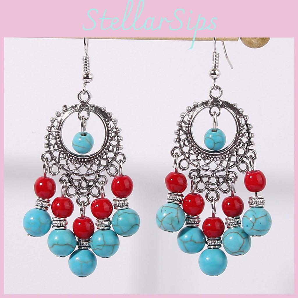 These bohemian-inspired tassel earrings feature a water-drop shape crafted from durable alloy. they showcase intricate handwork with traditional accents and vibrant turquoise, red, or sky blue colors. Ideal for festival, vacation, or cultural events, they add a vintage ethnic touch to any outfit. Wipe clean with a soft cloth to maintain their vibrant finish.