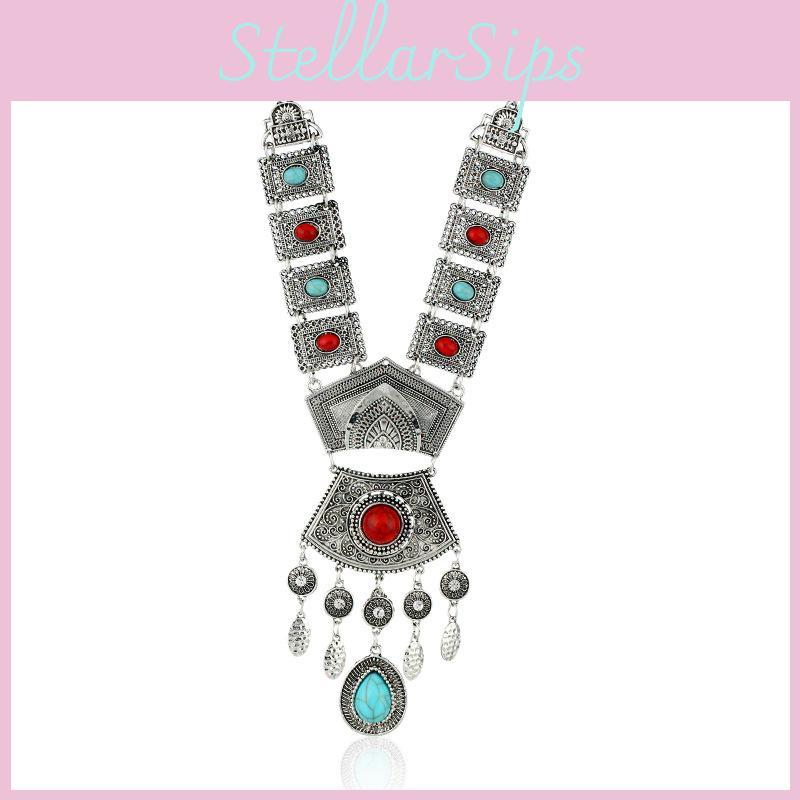 Ethnic Style Simulation Gemstone Decor Women Metal Necklace With Tassel For Womens Jewelry