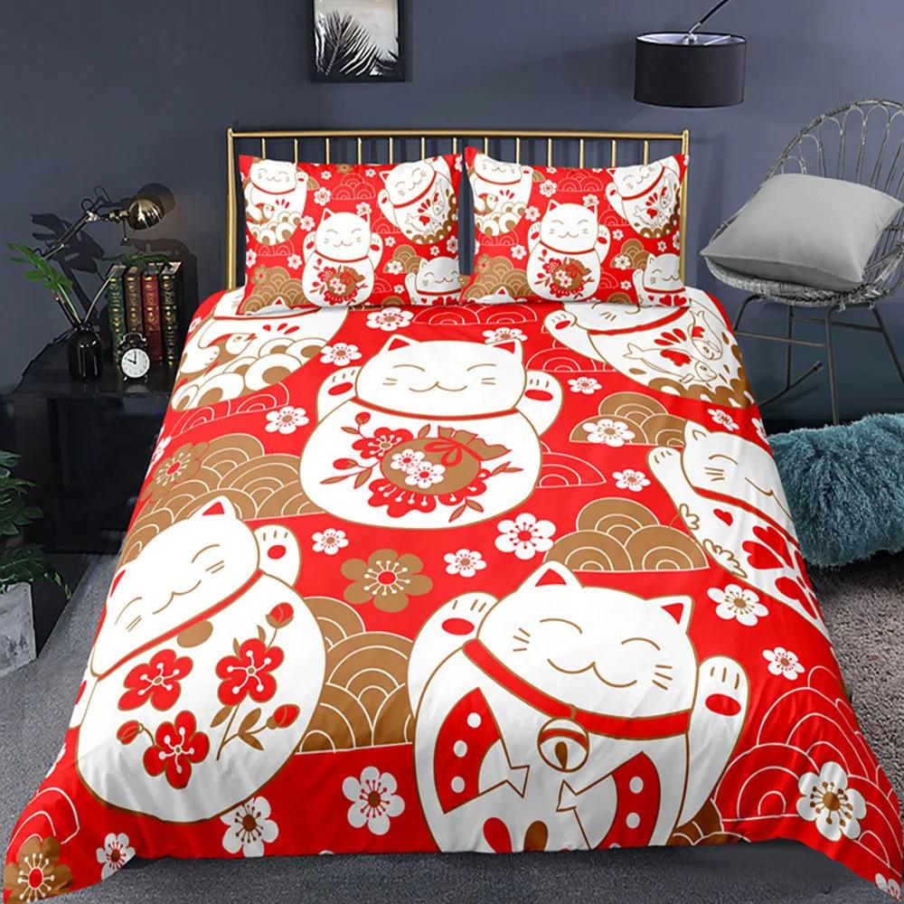 Japanese Lucky Cat Quilt Cover Set Japanese Cute Bedding Set With Pillowcase Quilt Cover Three-Piece Set