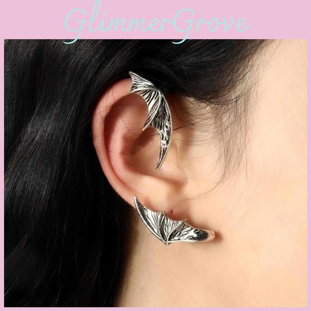 This Halloween-themed earring set features vampire bat designs crafted from durable alloy with electroplated finishing for a sleek look. designed as ear cuffs and hooks suitable for non-pierced ears. Ideal for costume parties or themed events, these earrings add a gothic touch to any outfit. To maintain their shine, wipe with a soft cloth after use.
