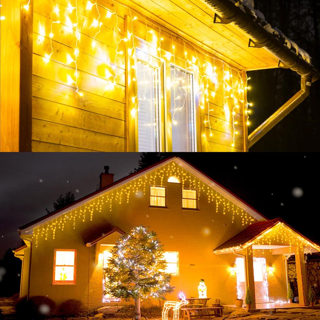 [8 Lighting Modes, Mode Memory, and Timer Function] These Christmas fairy lights create a romantic and soothing atmosphere with their warm-colored illumination. These icicle lights can also be set to eight different lighting patterns, including constant lighting and flashing, to suit your mood. They also feature a mode memory function, meaning they will remain in the same lighting mode even after you turn them off. Plus, if you keep the lights plugged in, they can be set to turn on at roughly the same time each day and then turn off after about six hours.
