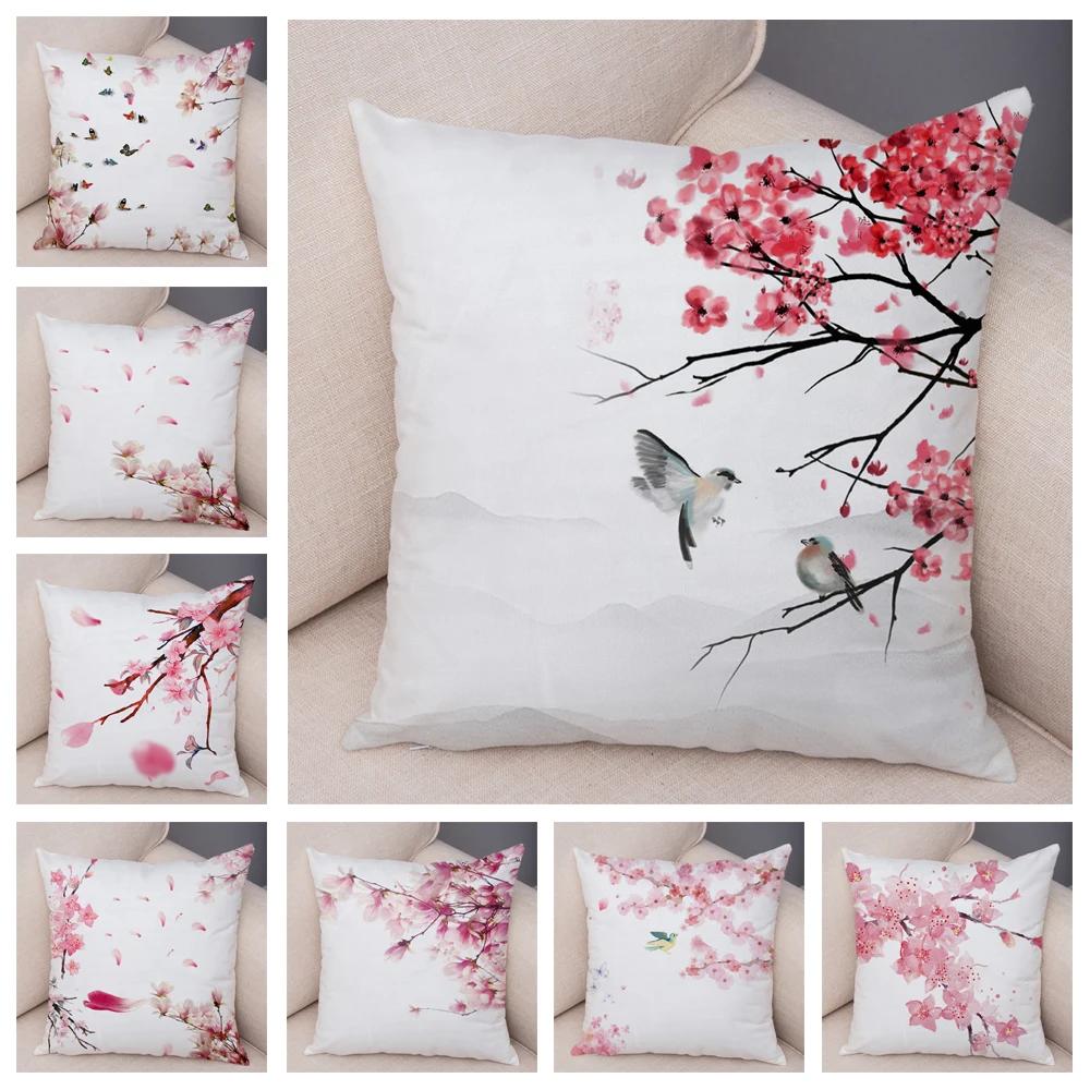 Pink Peach Blossom Cushion Cover Decor Watercolor Cartoon Plant Tree Pillow Case for Sofa Home Car Soft Plush Pillowcase 45x45cm