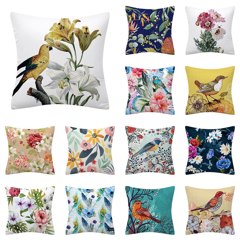 Colorful Plant Flower and Bird Print Pattern Polyester Cushion Cover for Home Living Room Sofa Bedroom Decorative Pillowcase