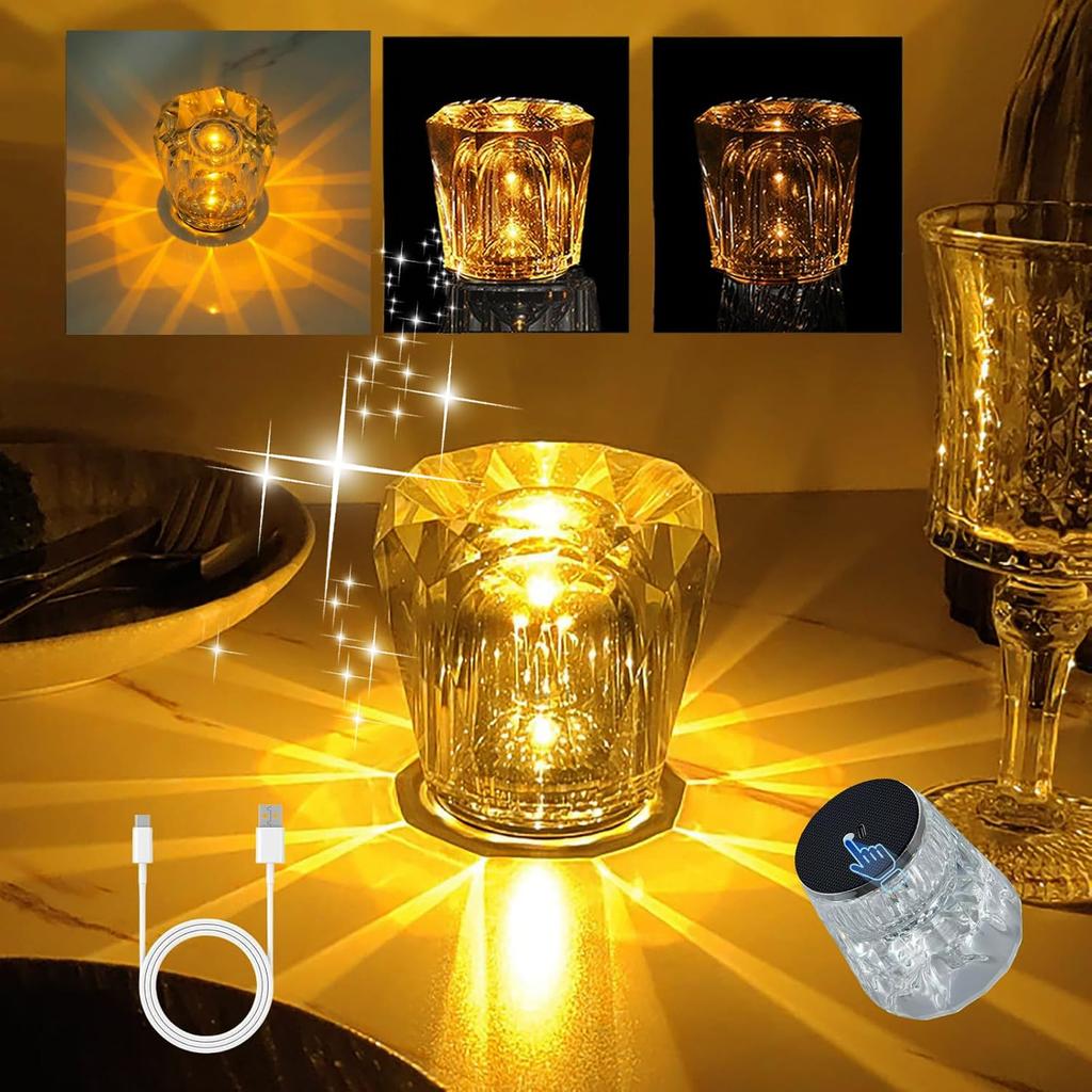 USB Rechargeable Crystal Diamond Table Lamp - Ambient Lighting. It comes with a USB charging cable, so no plugging in is required. The crystal table lamp lasts for 20 hours on a full charge. The light uses high-quality LED chips, providing a soft, warm glow with no flicker.