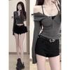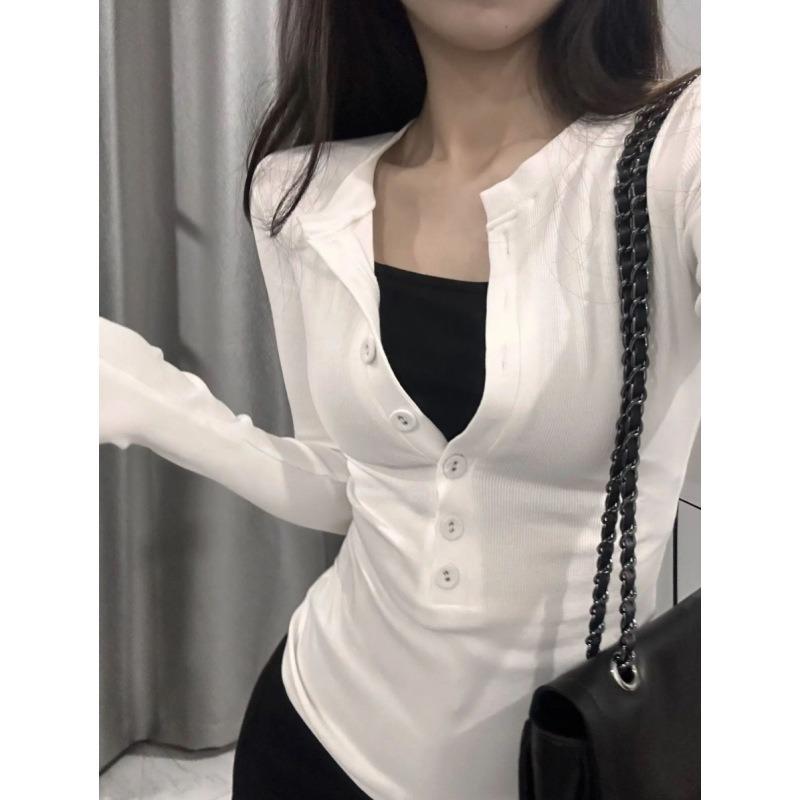 Spice Girl Shoulder Long Sleeve T-Shirt Women's Spring Skinny Single-breasted Top Bottom Shirt Tide