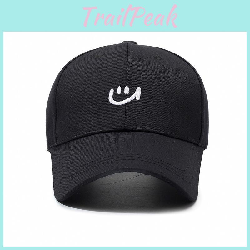 This Korean style happy face baseball cap features a breathable polyester-cotton blend with embroidered facial details, providing comfort and style. The adjustable strap ensures a snug fit, for versatile sizing. Suitable for casual outdoor wear in all seasons, it offers effective sun shading and ventilation. Wipe clean with a damp cloth to maintain its design and fabric quality.