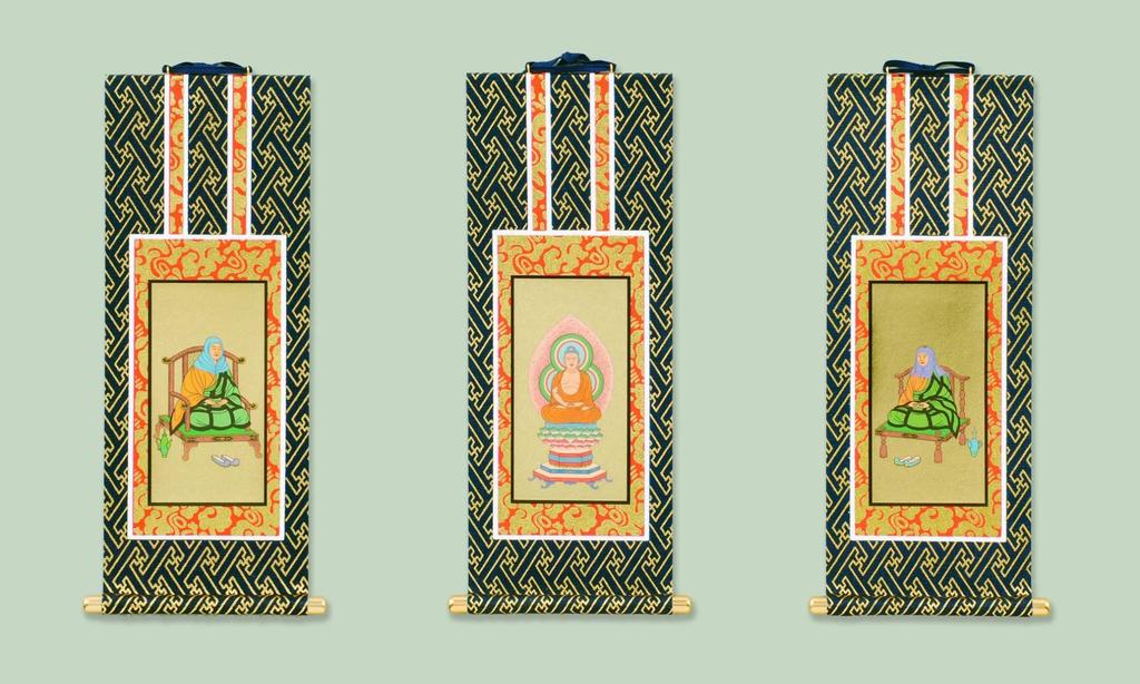 Set of 3 Hanging Scrolls from Kyoto Buddhist Altar Isemura, Navy Blue Mounting. Available In Various Sects and Sizes. Buddhist Altar Hanging Scrolls,