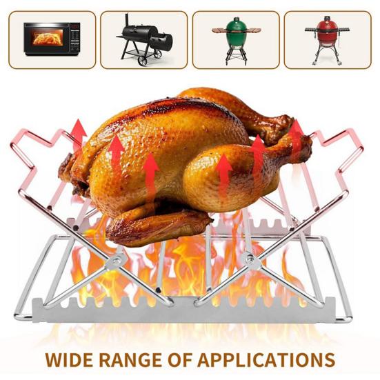 Introducing the roast chicken rack, a versatile grill accessory compatible with smokeless grills, charcoal grills, travel grills, and more. This rack folds flat for convenient storage and is suitable for most ovens and grills.
