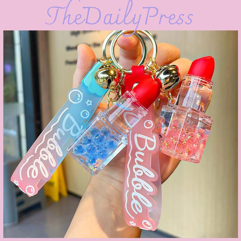 Unique Design: Features a creative oil and bubble-filled lipstick design that adds a fun and whimsical touch to your keys.