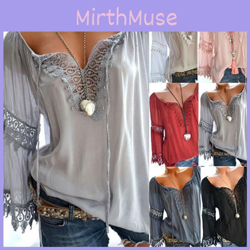 Women Sexy V Neck Long Sleeve Lace Up Shirt Casual Blouse Top Lady Loose T Shirt