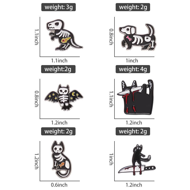 Animal Bone Enamel Pins Custom Dino Dog Owl Cat Brooches Lapel Badges Blck Kitten with Blood Knife Jewelry Gift for Friends