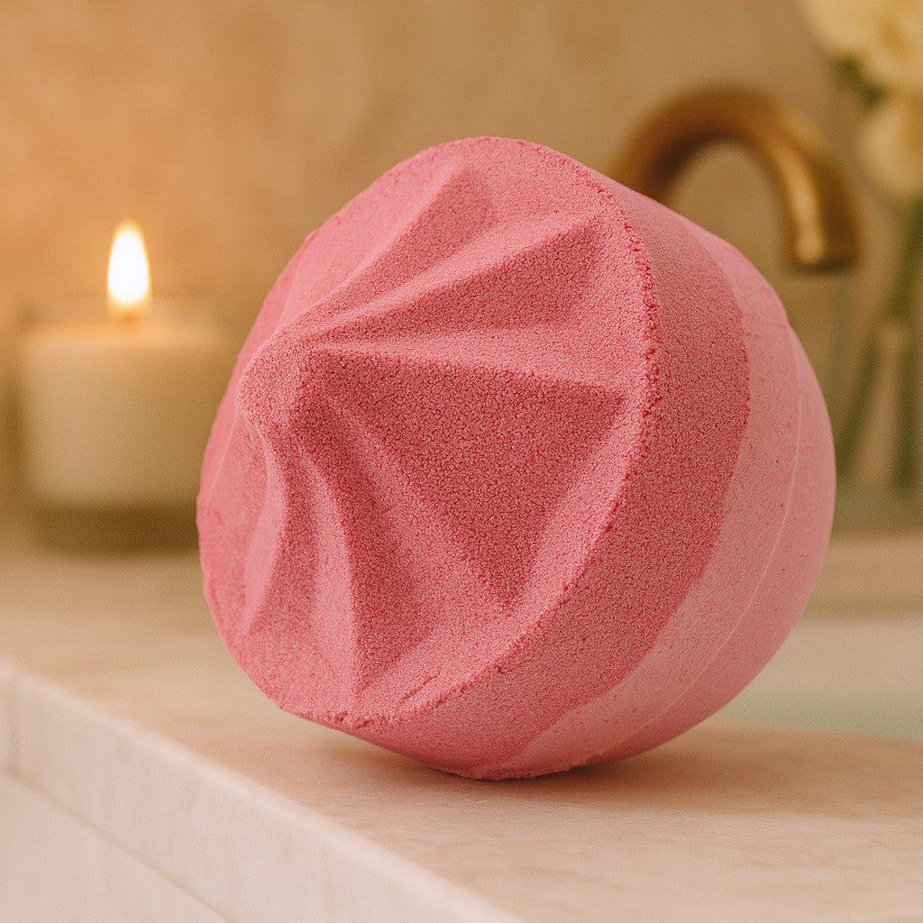 Matte and finely pressed to the touch, this two‑tone pink sphere is crowned with a faceted, star‑like peak. Its simple, tactile shape invites a pause before the soak—a small, joyful ritual you can hold in your hand. 🍓