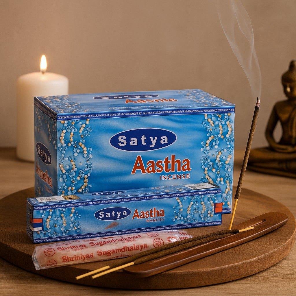 Aastha by Satya carries a classic Indian floral-woody profile: bright champa-like blossoms at the opening, a heart of creamy sandalwood with a whisper of spice, and a softly resinous, slightly powdery dry-down. The mood is calm and welcoming, steady rather than heavy. Crafted in India by the incense house behind the widely loved Nag Champa tradition, it reflects a daily practice found in many homes and temples—fragrance used to mark a pause, accompany prayer, or simply bring a sense of presence. For best use, light the tip, let it glow, then rest in an incense holder on a heat-safe surface.