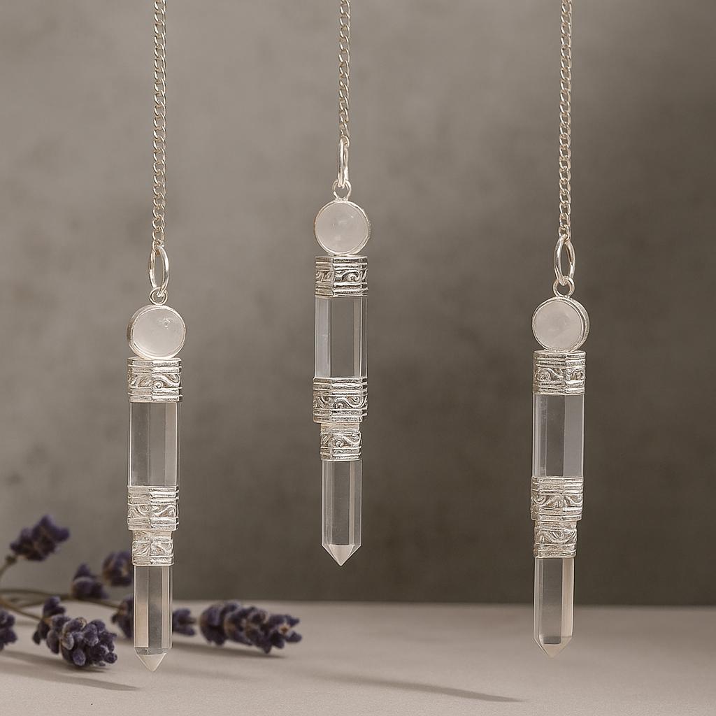 Held with a steady hand and a calm breath, the pendulum’s balanced weight finds stillness, then a gentle, readable swing. Many people use this quiet motion to support meditation, journaling check‑ins, or mindful decision‑making—posing simple questions to listen more closely to their inner voice. Clear quartz (rock crystal) is widely appreciated across traditions as a symbol of clarity, openness, and refined attention, making it a natural companion for reflective practices. 🧘