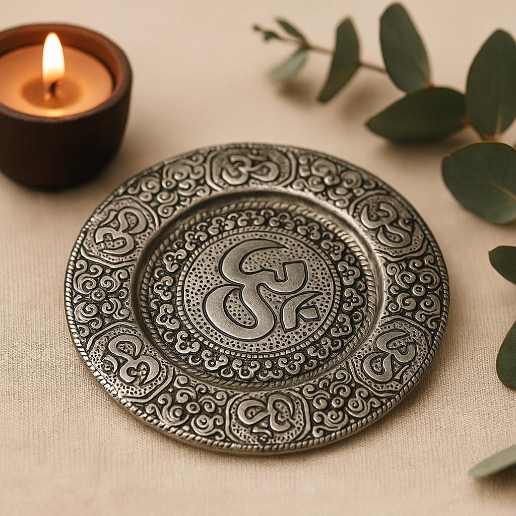 The shallow, 11 cm dish has a slightly raised rim to catch ash neatly. A large raised Om rests at the center like a medallion, framed by concentric beaded bands and fine scroll motifs. The silver surface is bright, while darkened recesses accent the relief, giving depth and a reassuring grip under the fingertips. Around the rim, smaller Om symbols repeat between dotted and swirl details—ornamental, textured, and quietly balanced. Suitable for incense sticks and cones, it keeps your surface protected and your ritual focused. 🧘