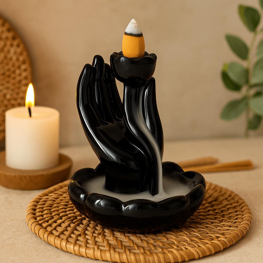 Sculpted in glossy black glazed ceramic, the minimalist hand-and-lotus form feels smooth, cool, and assured. Light glides over its contours; the piece stands as both art and function, turning a simple fragrance into a mindful ritual on a tea tray, shelf, or meditation corner. 🧘