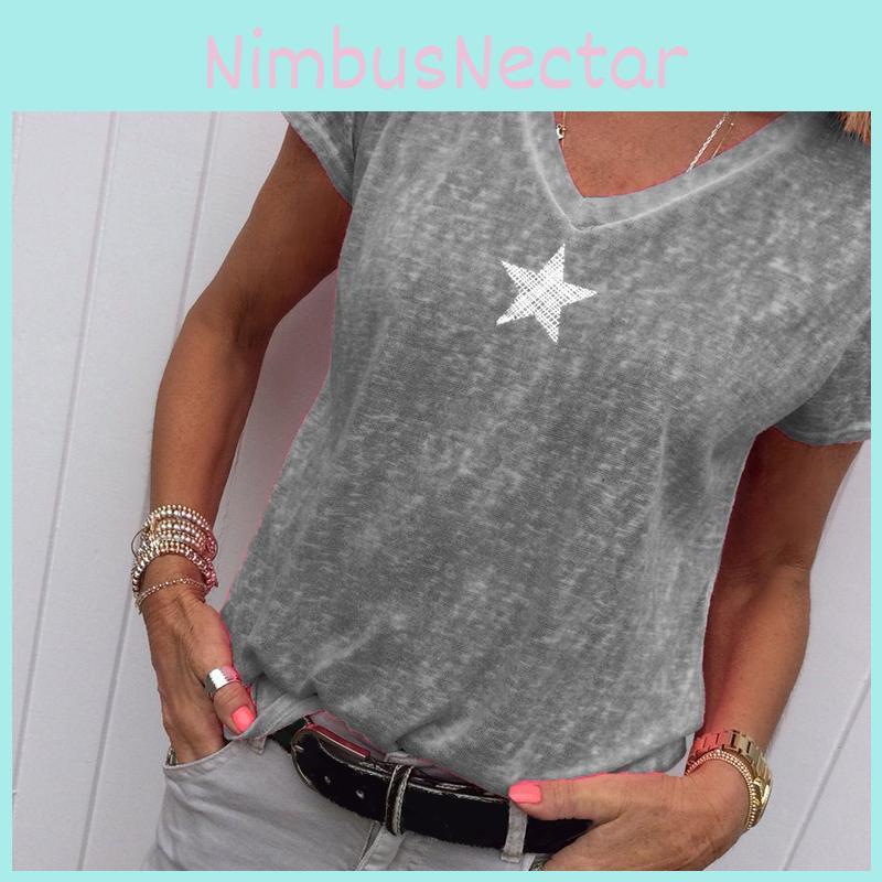 Stylish Women V-neck T-shirt Casual Loose Star Summer Shirts Solid Short Sleeve Perfect For Outdoor Activities