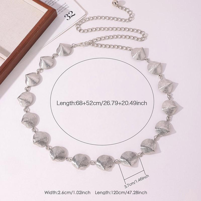 This stylish bohemian waist chain features a metallic construction with a lobster clasp and a 115cm length. Crafted with alloy hardware and electroplated for durability, it measures approximately 3.5cm wide, featuring shell and geometric design elements. Ideal for beach vacations or festival wear, it adds a fashionable touch to summer outfits. Wipe clean with a damp cloth to maintain its shine.