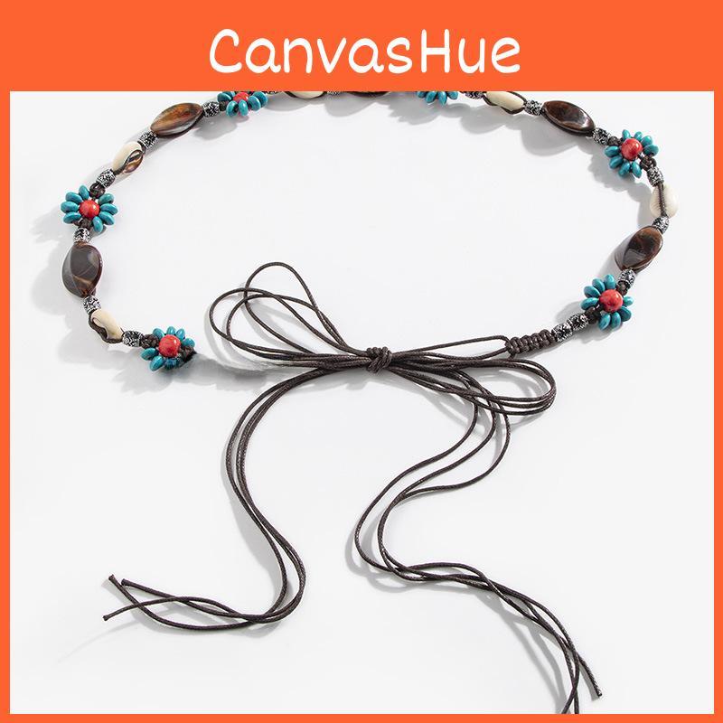 This bohemian-style woven floral belt features intricate handmade craftsmanship with cotton-linen material, measuring 2-4cm in width and designed to fit up to 180cm waist sizes. The waist tie uses a secure knot closure and features decorative wooden beads and geometric accents. Ideal for casual, resort, or festival outfits, it adds a touch of artistic vintage flair to everyday looks. Wipe clean with a damp cloth to maintain its detailed stitching and vibrant colors.