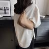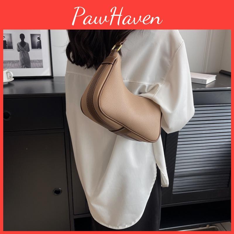 The bag is made of high-quality PU material, ensuring durability and longevity. The trendy dumpling bag design, with its contrasting stitching and colors.