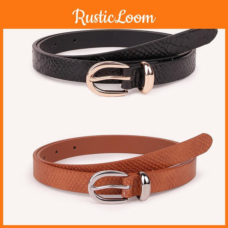 This fashion belt set features faux leather with a sleek, detailed design, combining snake or swirl patterns for versatile style. The slim width measures 1.3cm, with a length of 100cm and a durable alloy buckle with a pin closure. Ideal for casual or office wear, users can easily pair these belts with various outfits. Wipe clean with a damp cloth to maintain the finish.