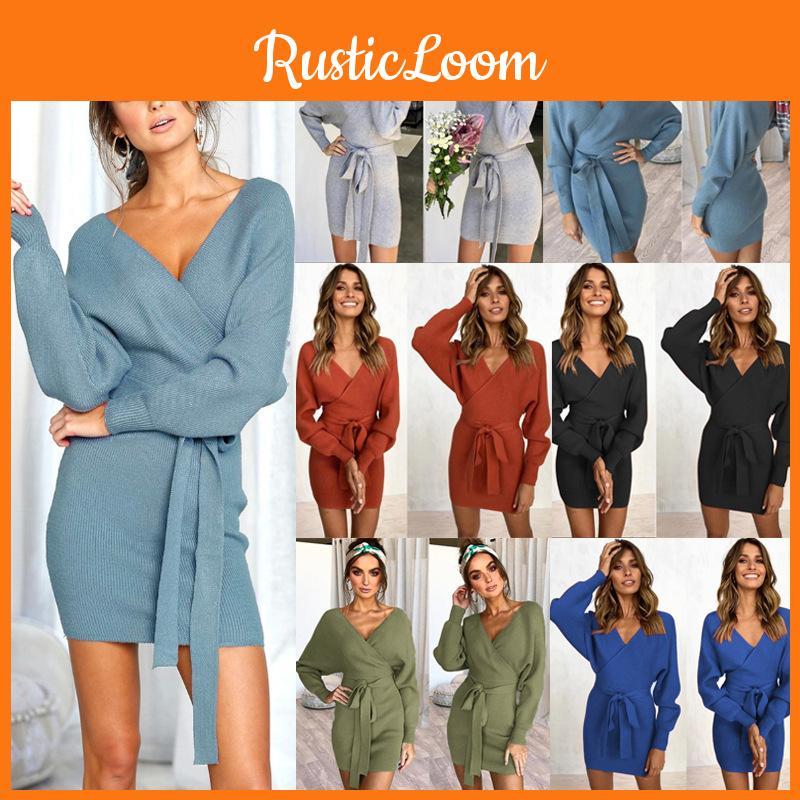 Elegant Women's V-neck Bodycon Jumper Dress With Long Sleeves And Tie Belt