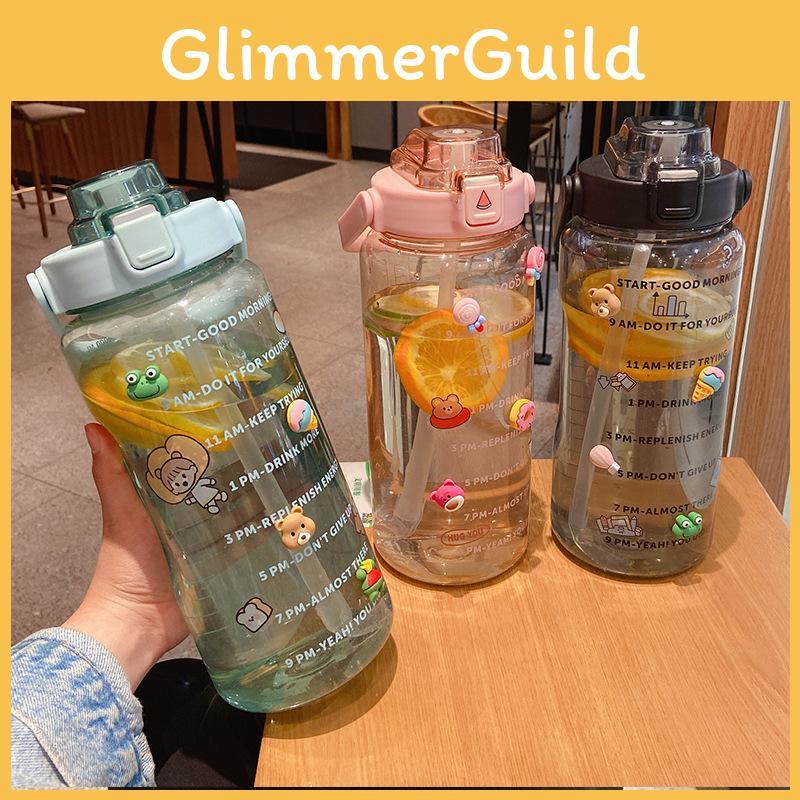 Large Capacity 2l Sports Straw Water Bottle With Time Marker And Fun Stickers