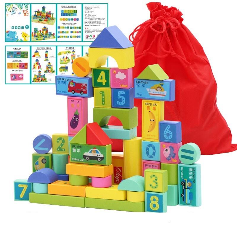 50pc Wooden Early Learning Blocks Kids Educational Toddlers Toy Set