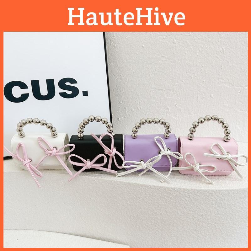 Cute Color-block Kids Shoulder Bag Mini Beaded Child Bag Fashion Bow Children Crossbody Bag Pink