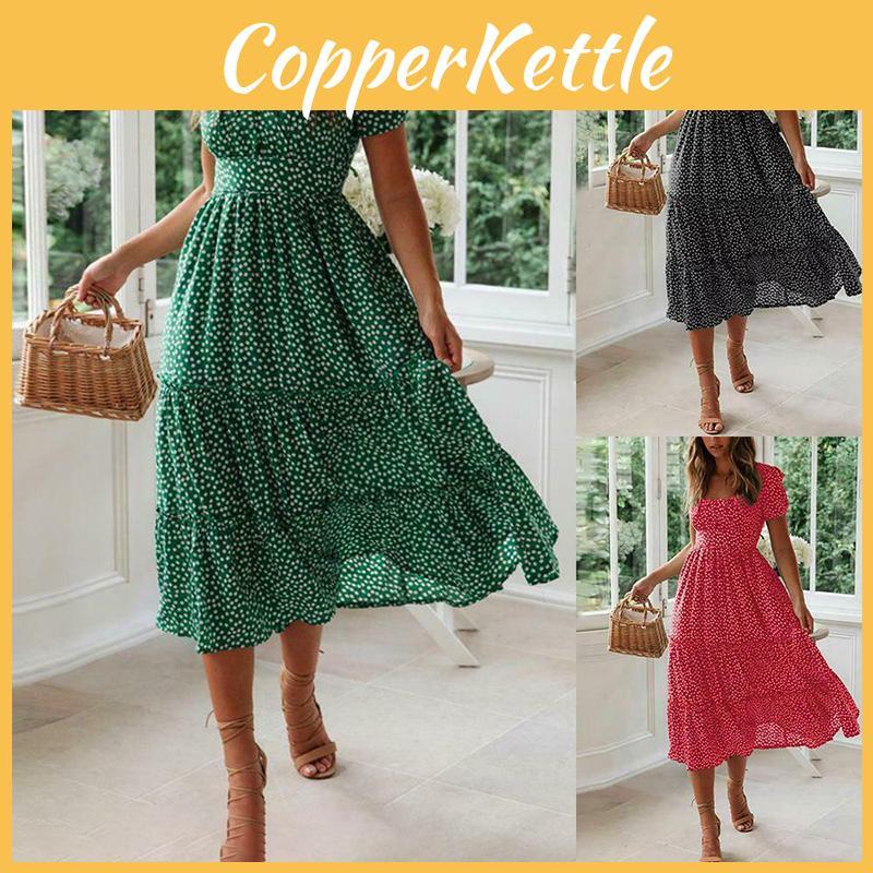 Elegant Women Polka Dot Boho Ruffle Maxi Beach Dress With Square Neckline