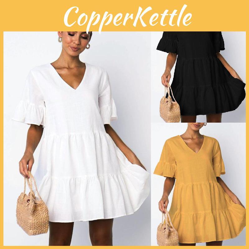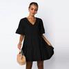 Elegant Women V-neck Plain Smock Dress With Loose Fit And Short Sleeve Design