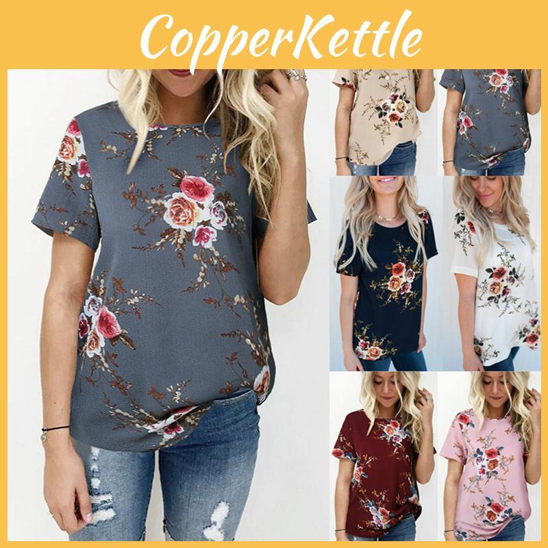 Elegant Summer Women Blouse Floral Print Short Sleeve Loose Casual T-shirt Tops