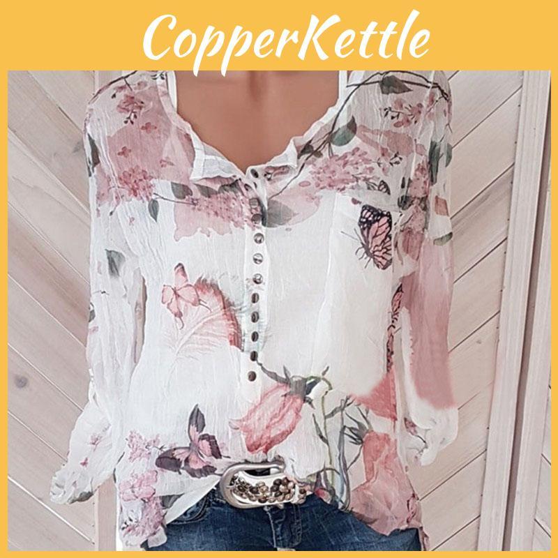Premium Quality Chiffon Women Casual Floral Printed Buttons T-shirt Irregular Tops Blouse