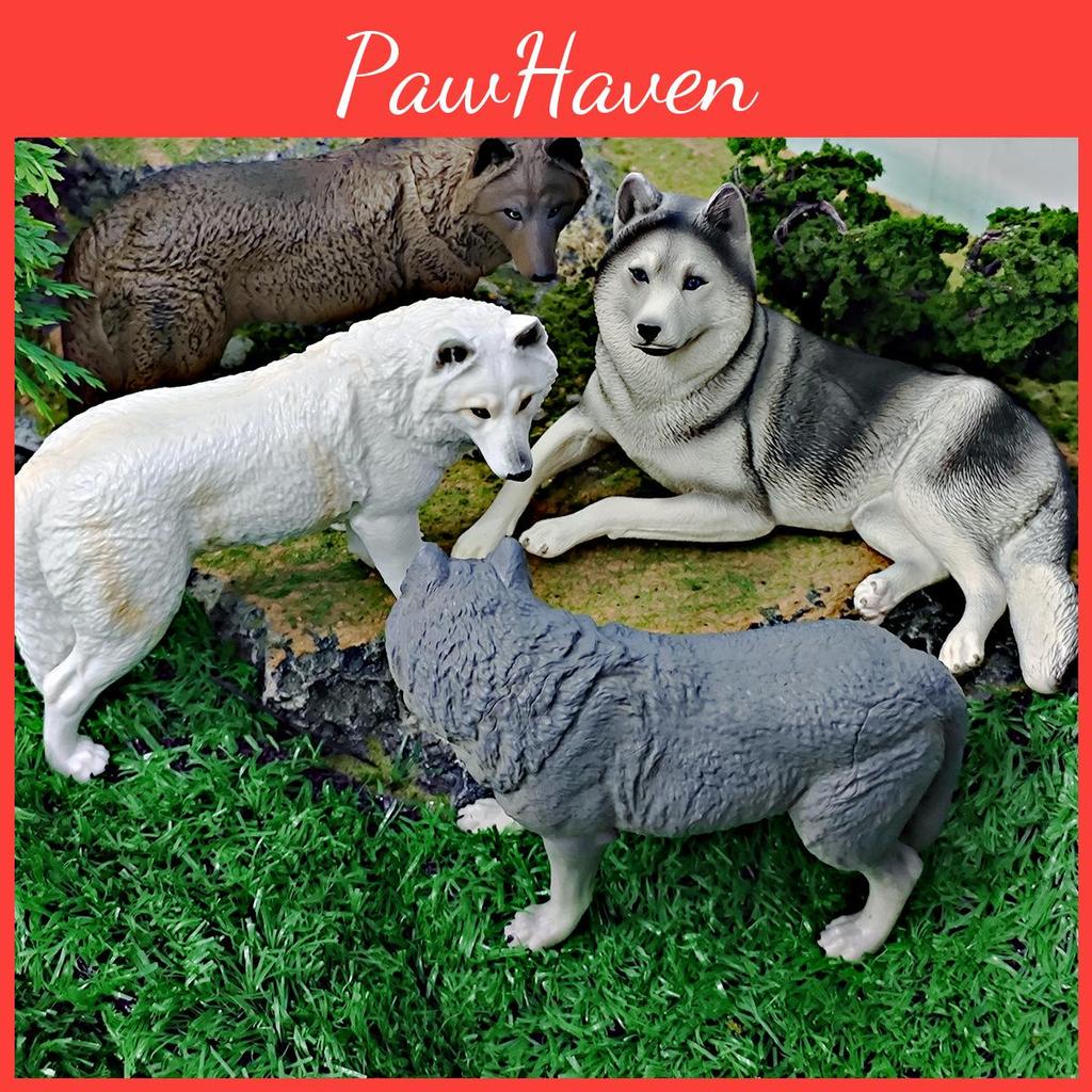 This realistic animal model collection features static PVC figures of wild canines, including a head-tilted blue wolf, gray wolf, white wolf, and a husky.Ideal for educational displays or nature-themed decor, they resist fading and are easy to clean with a damp cloth.