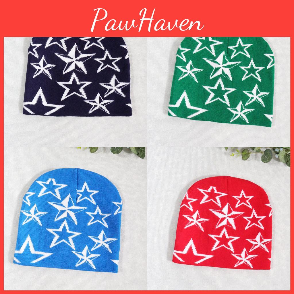 This knit hat features a round crown and seamless brim, crafted from acrylic yarn with a textured jacquard pattern and star-shaped design, measuring approximately 9 inches in diameter. It provides reliable warmth with a soft, moisture-resistant material ideal for fall outdoor activities. Easy to maintain, simply wipe clean for continued use.