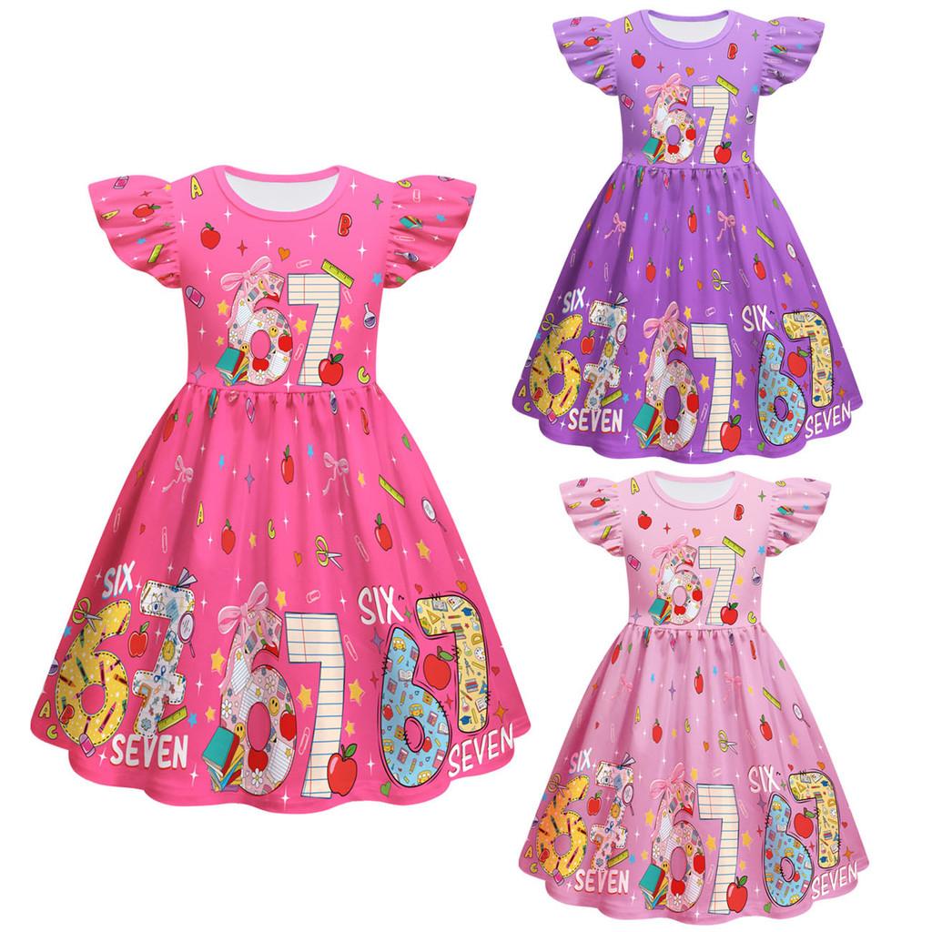 82838 Kids Girls Steal a Brainrot 67 Six Seven Print Ruffle Sleeveless Princess Dress