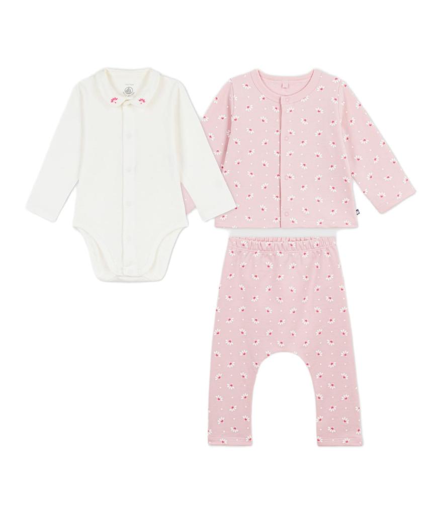 This adorable 3-piece baby set features a floral pattern. Made from environmentally friendly, sporty, and comfortable cotton, it's comfortable to wear. The top and body have a wide front opening, and the pants have an elastic waist for easy dressing. This item is perfect for use at home or as a gift for a new baby. Note: Dark colors may fade or transfer color when rubbed or washed. Wash separately with a mild detergent.