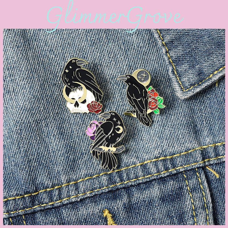 Geometric Black Bird Brooch Elegant Rose Flower Crow Enamel Pin For Fashion Lovers