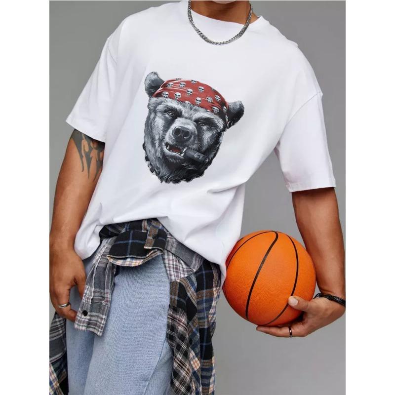 Bear Head Bandana T Shirt White Bear with Red Skull Bandana and Cigar Graphic Streetwear Casual Wear