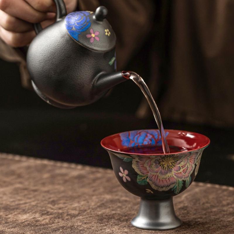 Kesi Handmade Flower Teacups Ceramic Black Master Cups High Foot Cup Chinese Kung Fu Tea Sets Household Tea Ceremony Teaware