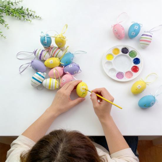 These 12 simulated plastic Easter eggs feature vibrant colors and charming designs including flowers, stripes, and butterflies, perfectly capturing the spirit of spring and Easter. Crafted from high-quality PS material and delicately painted, each egg is adorned with a ribbon for easy hanging on trees or as decorative accents.