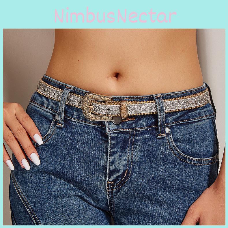 Women's Carved Buckle Belt With Ins Style Pu Leather Fashion Waistband European And American Personality Glittery Skinny Jeans Belt