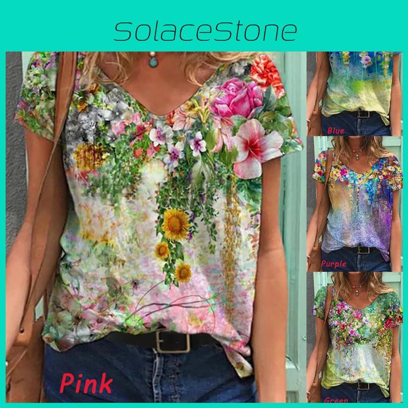 Comfortable Womens V Neck Short Sleeve Blouse Casual Floral Print T-shirt Tunic Tops