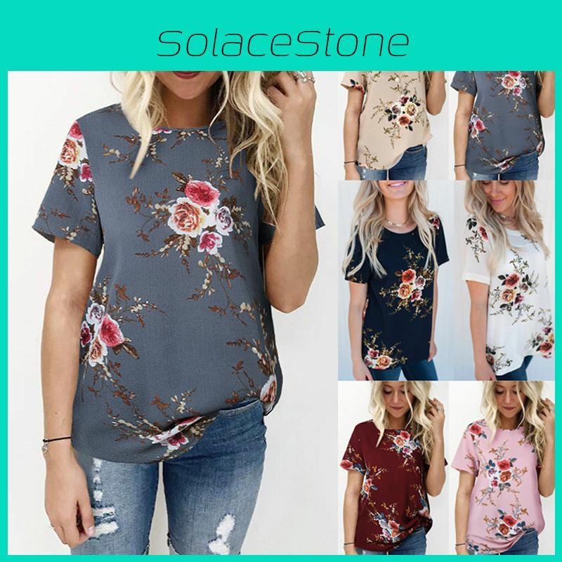 Elegant Summer Women Blouse Floral Print Short Sleeve Loose Casual T-shirt Tops
