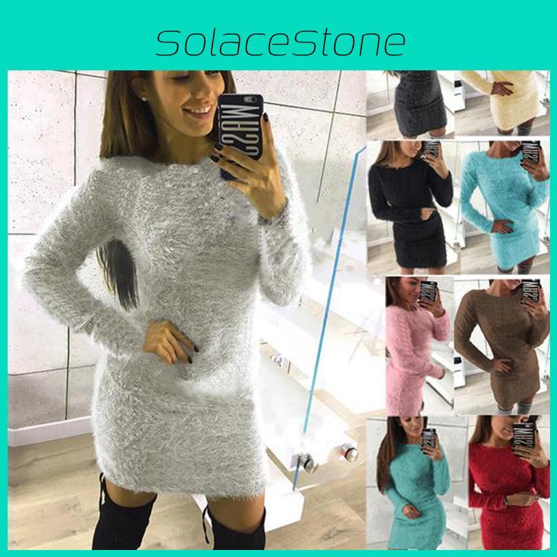 Women's Fluffy Long Sleeve Sweater Top Cozy Bodycon Mini Jumper Dress Blouse